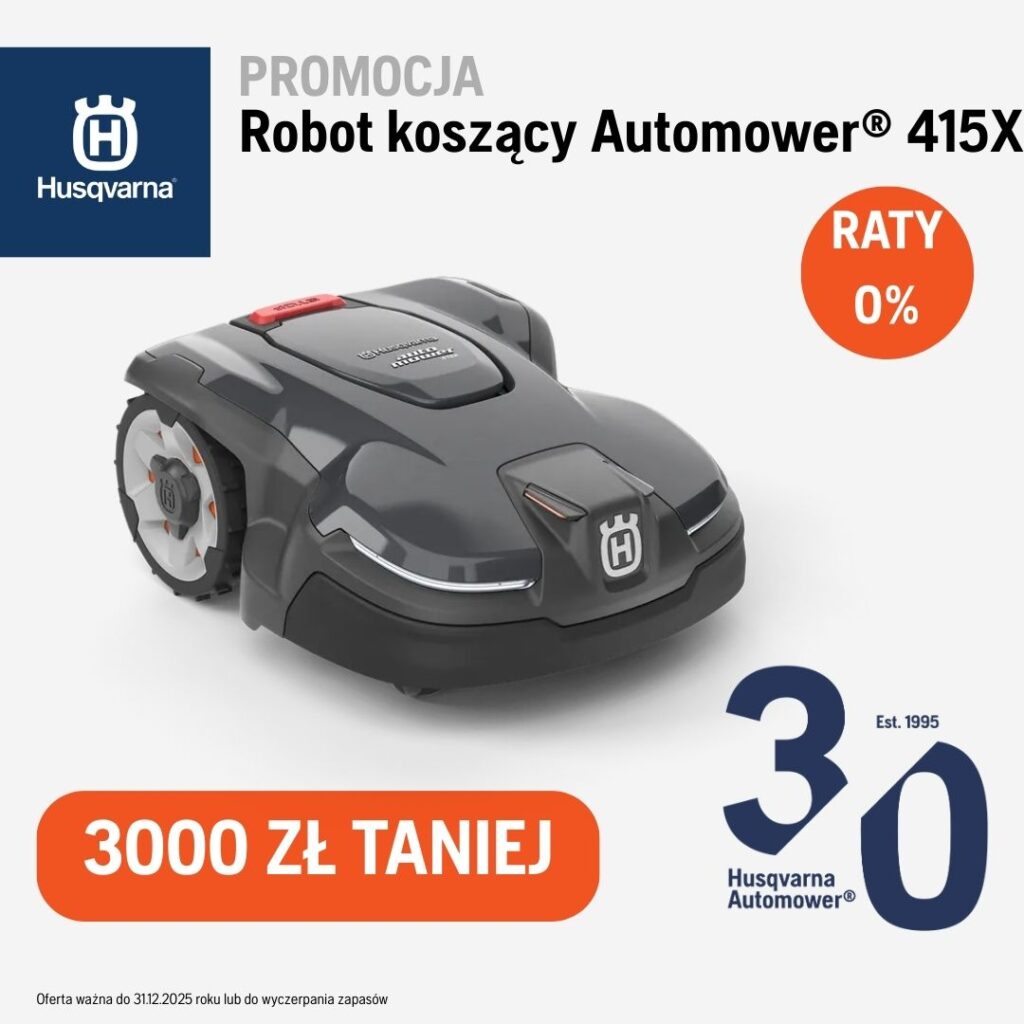 Tylko teraz Robot koszący Automower® 415X 3000 zł taniej. Oferta ważna do 31.12.2025 roku lub wyczerpania zapasów.