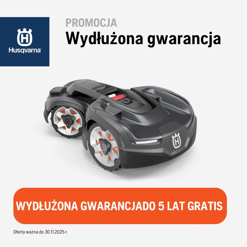 Tylko teraz przy zakupie wybranych robotów koszących Husqvarna Automower® otrzymasz wydłużoną gwarancję do 5 lat – GRATIS! Oferta ważna do 30.11.2025 i dotyczy klientów indywidualnych.